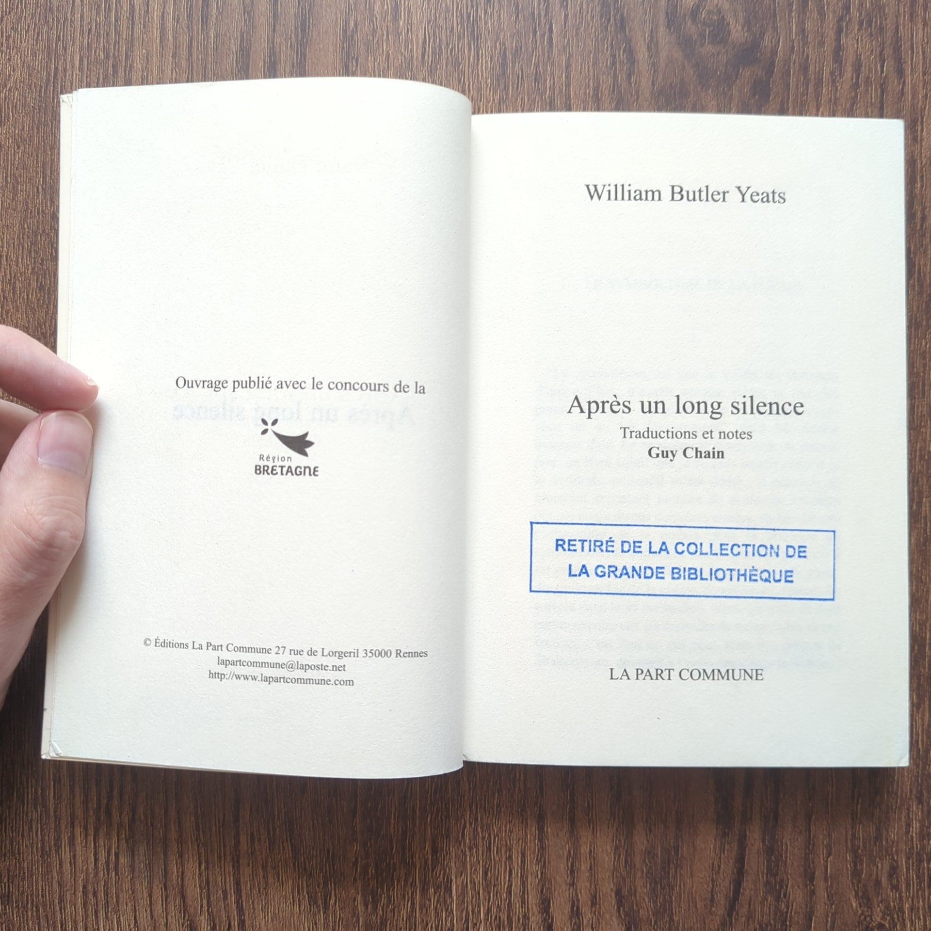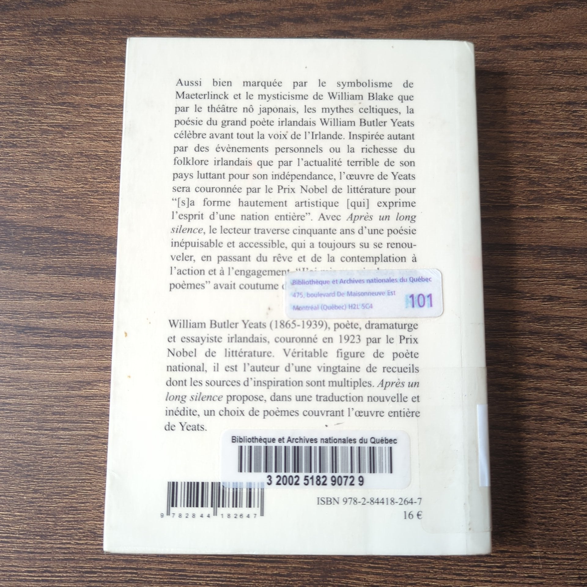 Aussi bien marquée par le symbolisme de Maeterlinck et le mysticisme de William Blake que par le théâtre nô japonais, les mythes celtiques, la poésie du grand poète irlandais William Butler Yeats célèbre avant tout la voix de l'Irlande. Inspirée autant par des événements personnels ou la richesse du folklore irlandais que par l'actualité terrible de son pays luttant pour son indépendance, l'œuvre de Yeats sera couronnée par le Prix Nobel de littérature pour "[s]a forme hautement artistique [qui] exprime l'esprit d'une nation entière". Avec Après un long silence, le lecteur traverse cinquante ans d'une poésie inépuisable et accessible, qui a toujours su se renouveler, en passant du rêve et de la contemplation à l'action et à l'engagement. J'ai mis ma vie dans mes poèmes" avait coutume de dire Yeats.