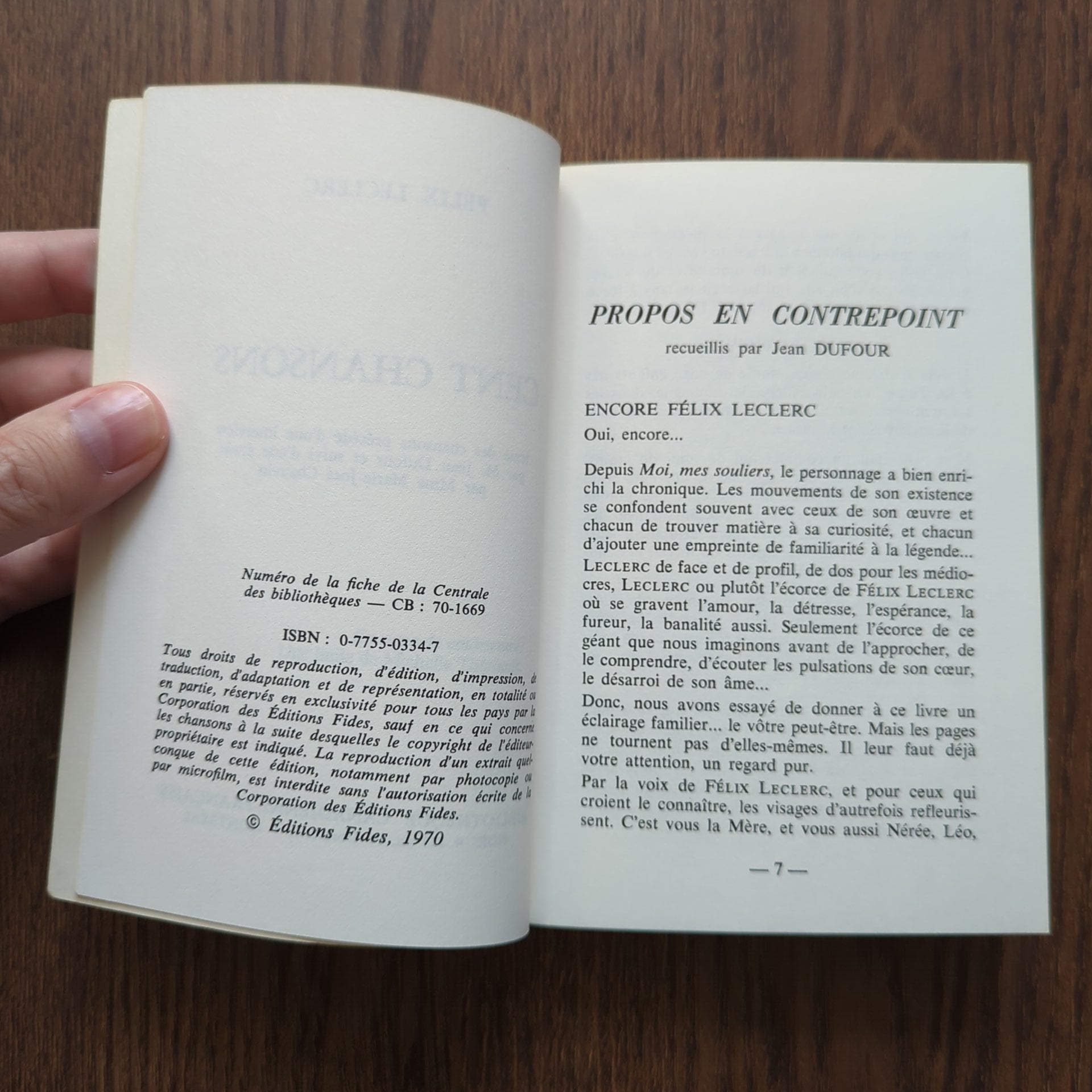 "L’hymne au printemps", "Le train du Nord", "Moi, mes souliers", "Le p’tit bonheur": certaines chansons de Félix Leclerc sont dans les coeurs comme sur toutes les lèvres. On les trouvera dans ce recueil, à côté d’autres moins connues, mais douées de la même fraîcheur et du pouvoir d’évocation qui ont fait de Félix Leclerc le trouvère de notre époque.