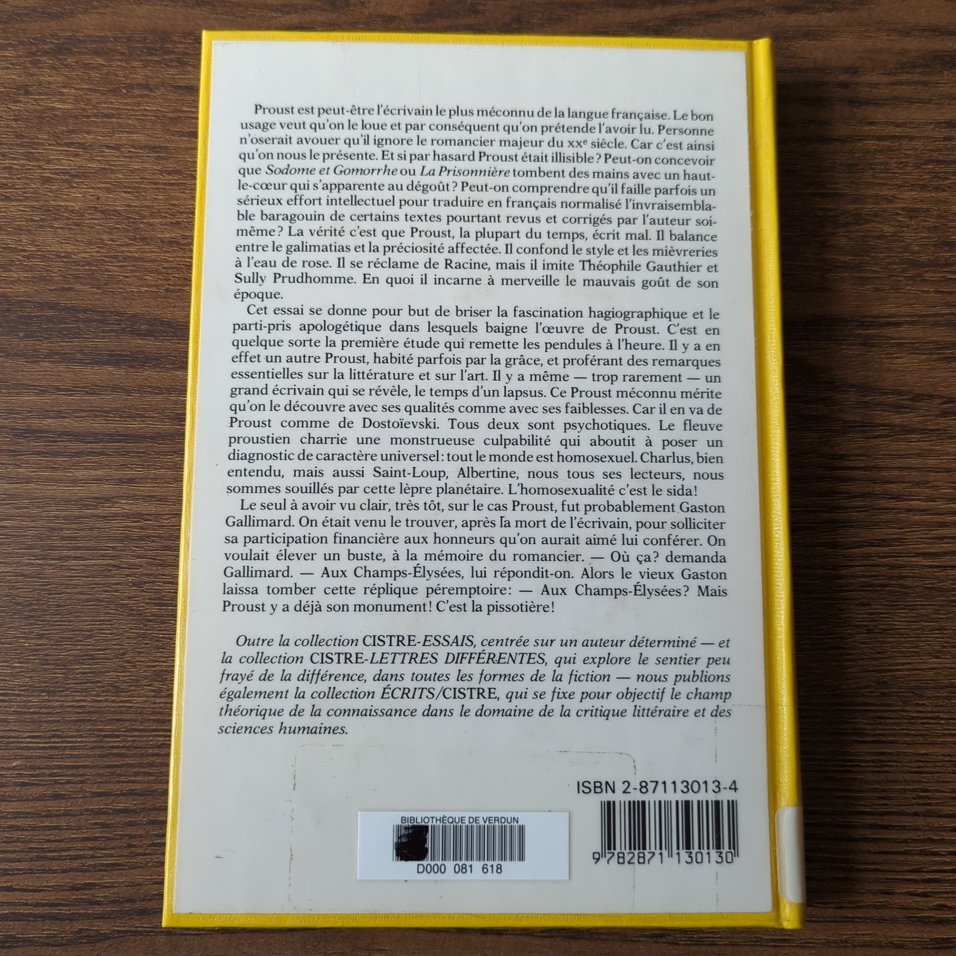 Cet essai se donne pour but de briser la fascination hagiographique et le parti-pris apologétique dans lesquels baigne l'œuvre de Proust. C'est en quelque sorte la première étude qui remette les pendules à l'heure. Il y a en effet un autre Proust, habité parfois par la grâce, et proférant des remarques essentielles sur la littérature et sur l'art. Il y a même trop rarement - un grand écrivain qui se révèle, le temps d'un lapsus. Ce Proust méconnu mérite qu'on le découvre avec ses qualités comme avec ses faiblesses. Car il en va de Proust comme de Dostoïevski. Tous deux sont psychotiques. Le fleuve proustien charrie une monstrueuse culpabilité qui aboutit à poser un diagnostic de caractère universel: tout le monde est homosexuel. Charlus, bien entendu, mais aussi Saint-Loup, Albertine, nous tous ses lecteurs, nous sommes souillés par cette lèpre planétaire. L'homosexualité c'est le sida!