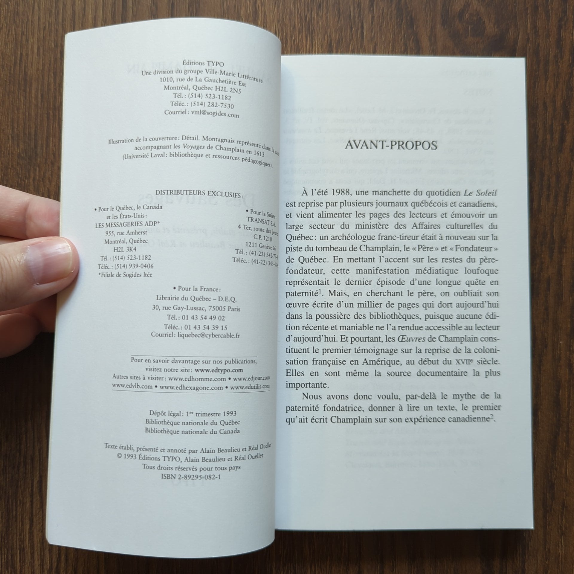 Les Oeuvres de Champlain constituent le témoignage le plus important sur la reprise de la colonisation française en Amérique au début du XVIe siècle. Des Sauvages, la première de ces œuvres, rend compte des bouleversements géopolitiques considérables qu'ont connus les populations amérindiennes de la vallée du Saint-Laurent après la venue de Jacques Cartier. Elle montre aussi que, si Champlain cherchait encore un passage vers la Chine, il suggérait également la première ébauche d'une stratégie coloniale française axée sur l'exploration et la traite des fourrures. Nous la rééditons ici accompagnée d'une introduction, de notes, d'appendices, d'une bibliographie et d'un index.