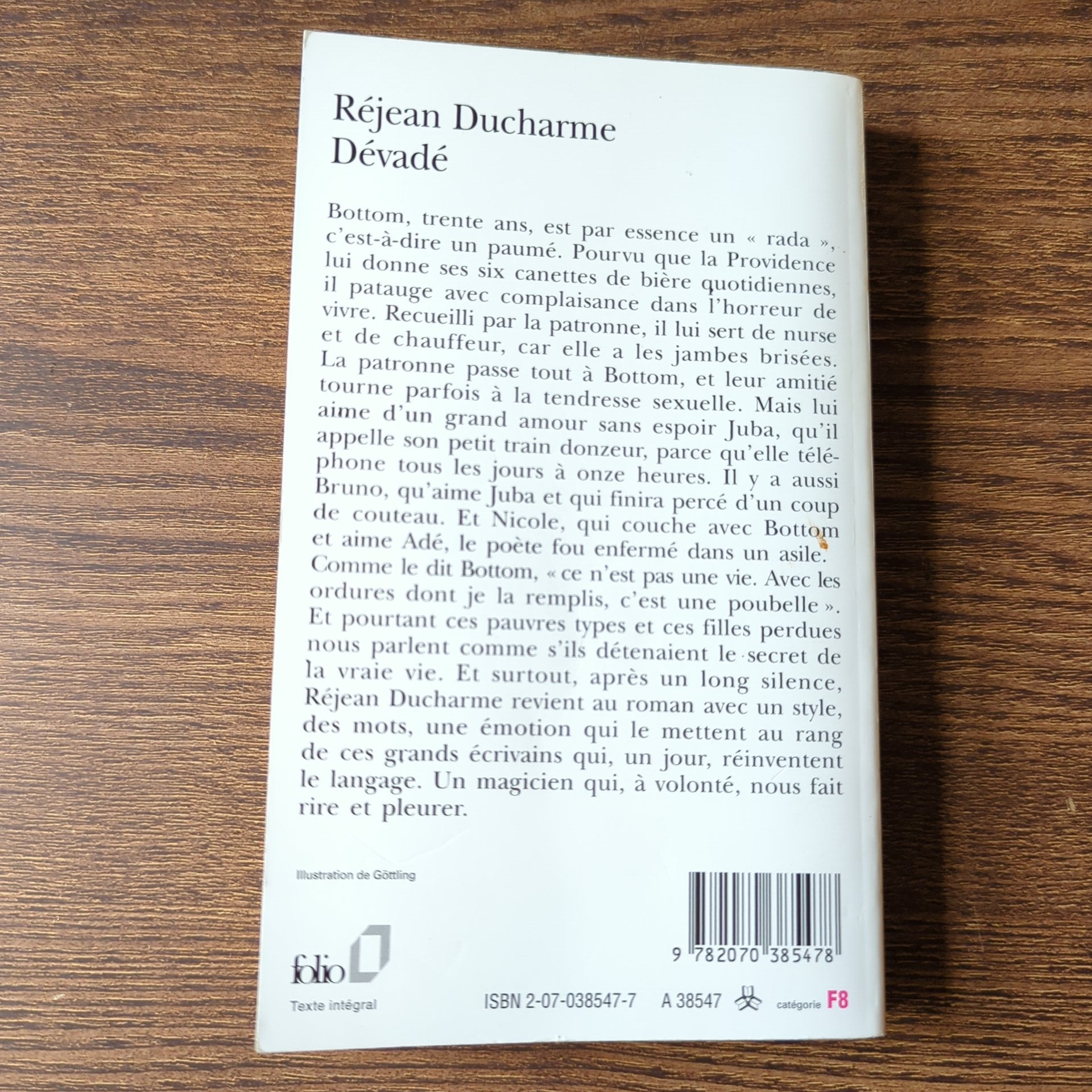 Bottom, trente ans, est par essence un "rada", c'est-à-dire un paumé. Pourvu que la Providence lui donne ses six canettes de bière quotidiennes, il patauge avec complaisance dans l'horreur de vivre. Recueilli par la patronne, il lui sert de nurse et de chauffeur, car elle a les jambes brisées. La patronne passe tout à Bottom, et leur amitié tourne parfois à la tendresse sexuelle. Mais lui aime d'un grand amour sans espoir Juba, qu'il appelle son petit train donzeur, parce qu'elle téléphone tous les jours à onze heures. Il y a aussi Bruno, qu'aime Juba et qui finira percé d'un coup de couteau. Et Nicole, qui couche avec Bottom et aime Adé, le poète fou enfermé dans un asile. Comme le dit Bottom, "ce n'est pas une vie. Avec les ordures dont je la remplis, c'est une poubelle". Et pourtant ces pauvres types et ces filles perdues nous parlent comme s'ils détenaient le secret de la vraie vie. Et surtout, après un long silence, Réjean Ducharme revient au roman avec un style, des mots, une émotion qui le mettent au rang de ces grands écrivains qui, un jour, réinventent le langage. Un magicien qui, à volonté, nous fait rire et pleurer.