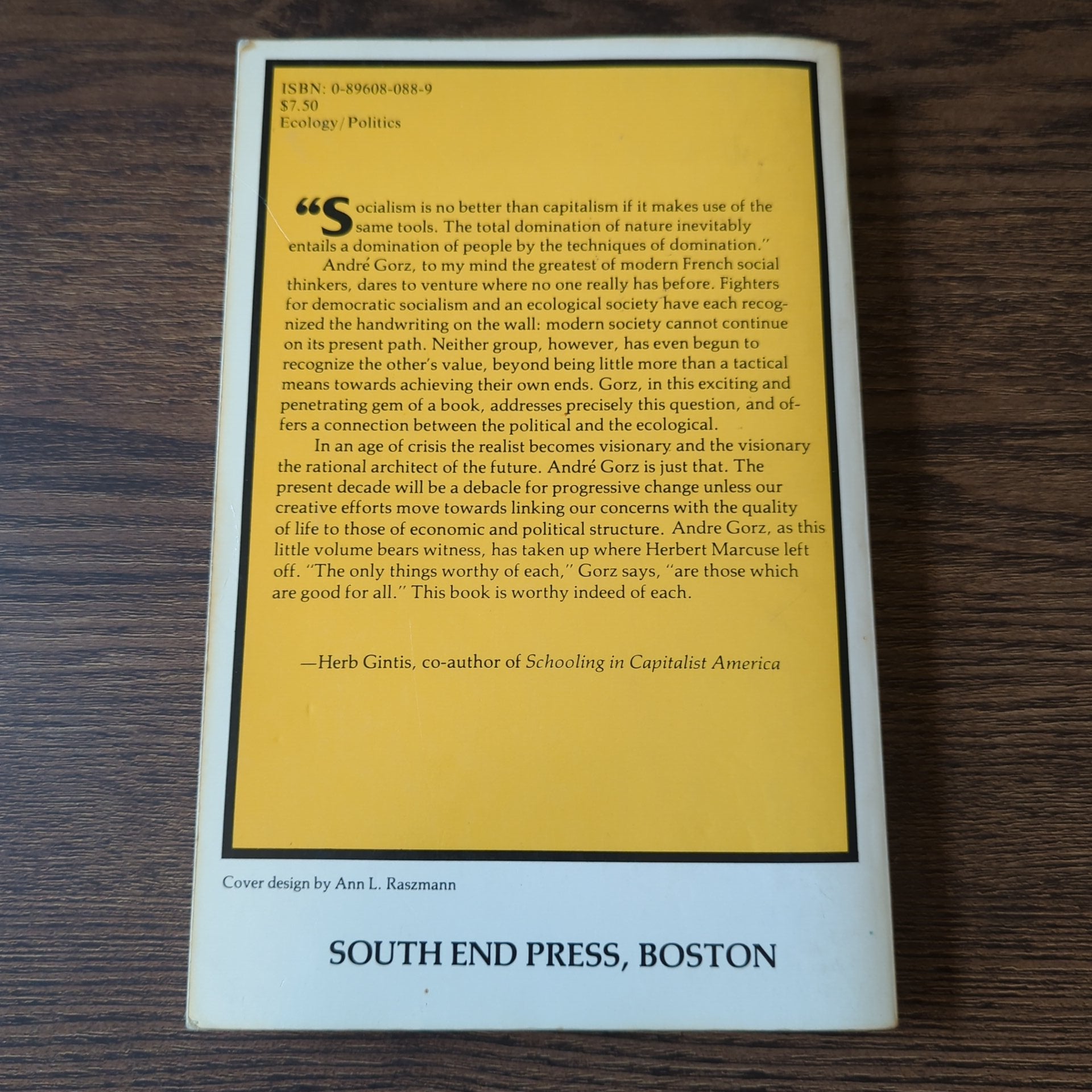 André Gorz, to my mind the greatest of modern French social thinkers, dares to venture where no one really has before. Fighters for democratic socialism and an ecological society have each recognized the handwriting on the wall: modern society cannot continue on its present path. Neither group, however, has even begun to recognize the other's value, beyong being little more than a tactial means towards achieving their own ends. Gorz, in this exciting and penetrating gem of a book, addresses precisely this question, and offers a connection between the political and the ecological.