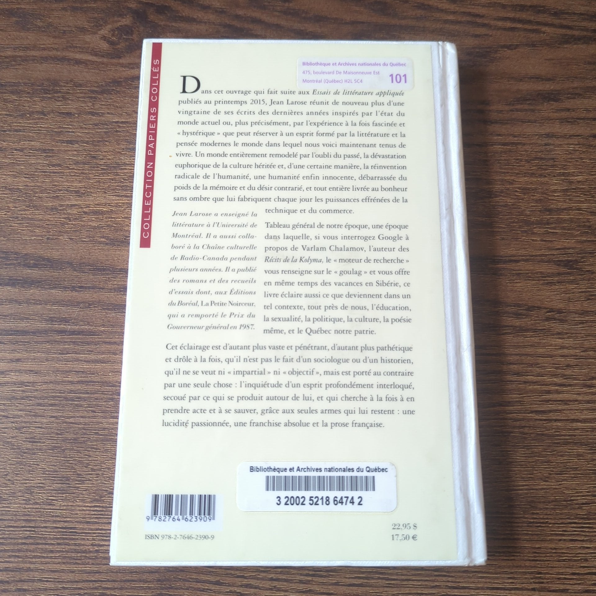 Dans cet ouvrage qui fait suite aux Essais de littérature appliquée publiés au printemps 2015, Jean Larose réunit de nouveau plus d'une vingtaine de ses écrits des dernières années inspirés par l'état du monde actuel ou, plus précisément, par l'expérience à la fois fascinée er hystérique que peut réserver à un esprit formé par la littérature et la pensée modernes le monde dans lequel nous voici maintenant tenus de vivre. Un monde entièrement remodelé par l'oubli du passé, la dévastation euphorique de la culture héritée et, d'une certaine manière, la réinvention radicale de l'humanité, une humanité enfin innocente, débarrassée du poids de la mémoire et du désir contrarié, et tout entière livrée au bonheur sans ombre que lui fabriquent chaque jour les puissances effrénées de la technique et du commerce.
