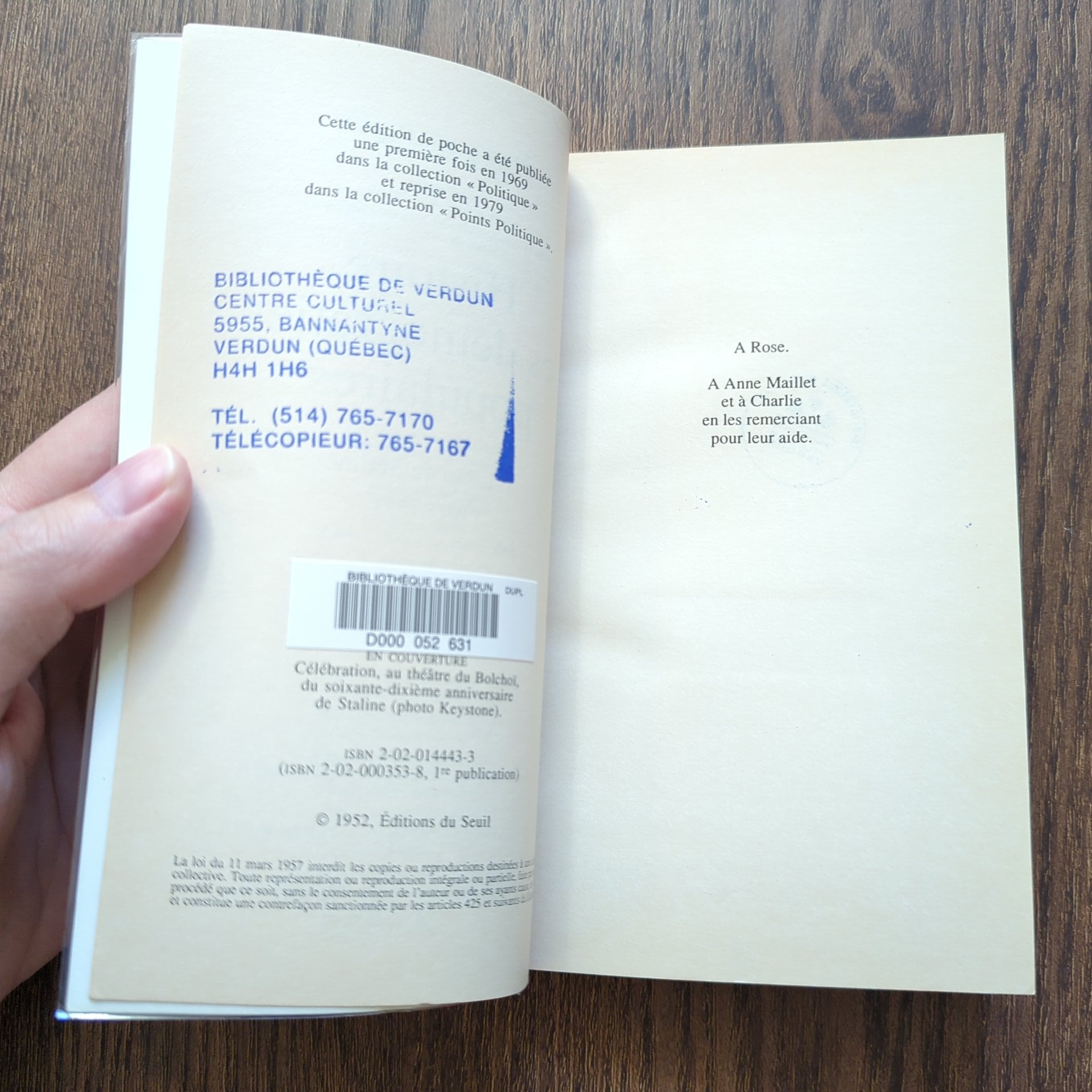 Remarques: Ancien livre de bibliothèque; présence d'étampes, d'autocollants, de code-barres, de feuillet de circulation. Pellicule protectrice sur l'ensemble de la couverture qui est en très bon état. Pages jaunies mais propres. Texte sans annotations. Reliure solide.