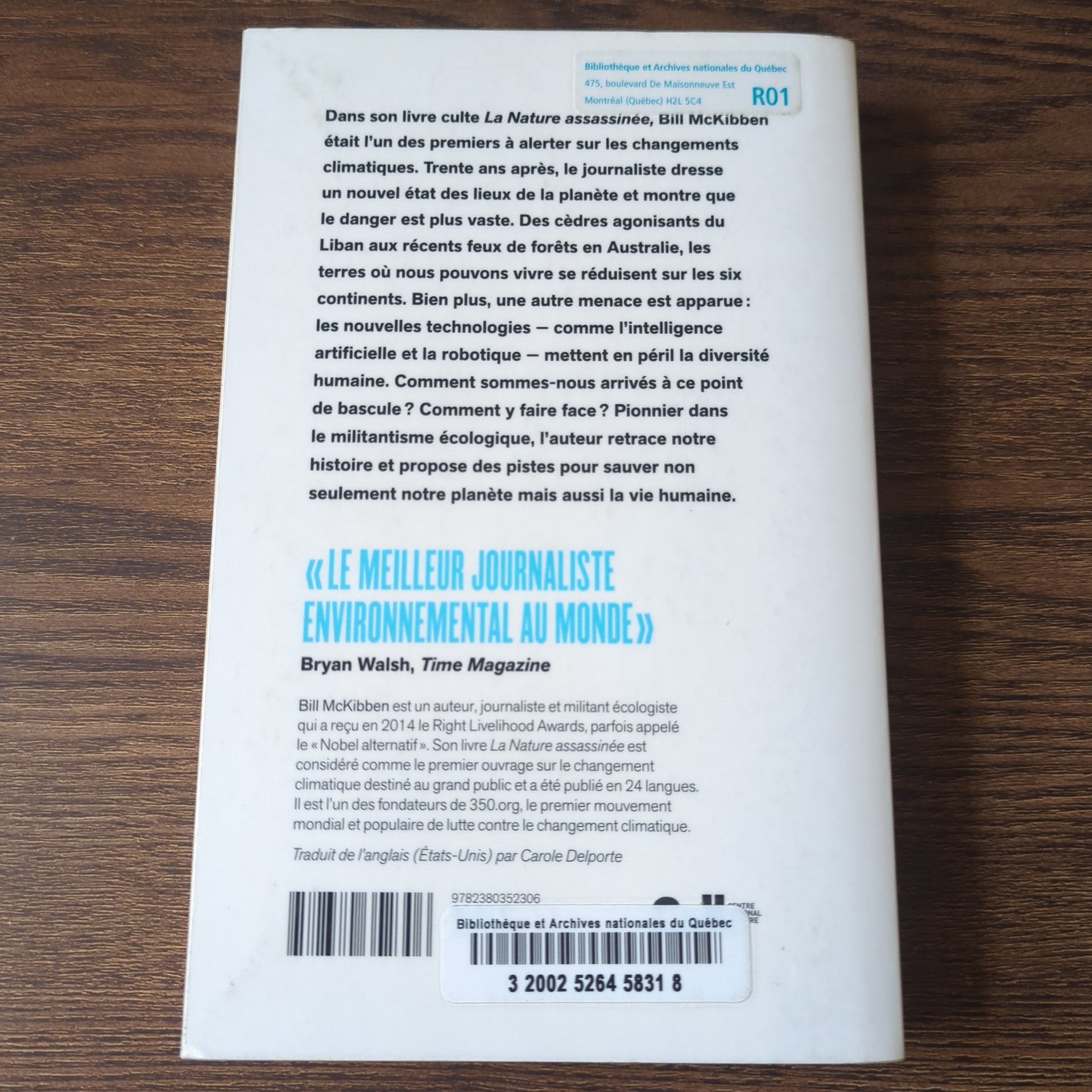 Dans son livre culte La Nature assassinée, Bill McKibben était l'un des premiers à alerter sur les changements climatiques. Trente ans après, le journaliste dresse un nouvel état des lieux de la planète et montre que le danger est plus vaste. Des cèdres agonisants du Liban aux récents feux de forêts en Australie, les terres où nous pouvons vivre se réduisent sur les six continents. Bien plus, une autre menace est apparue: les nouvelles technologies comme l'intelligence artificielle et la robotique mettent en péril la diversité humaine. Comment sommes-nous arrivés à ce point de bascule? Comment y faire face? Pionnier dans le militantisme écologique, l'auteur retrace notre histoire et propose des pistes pour sauver non seulement notre planète mais aussi la vie humaine.