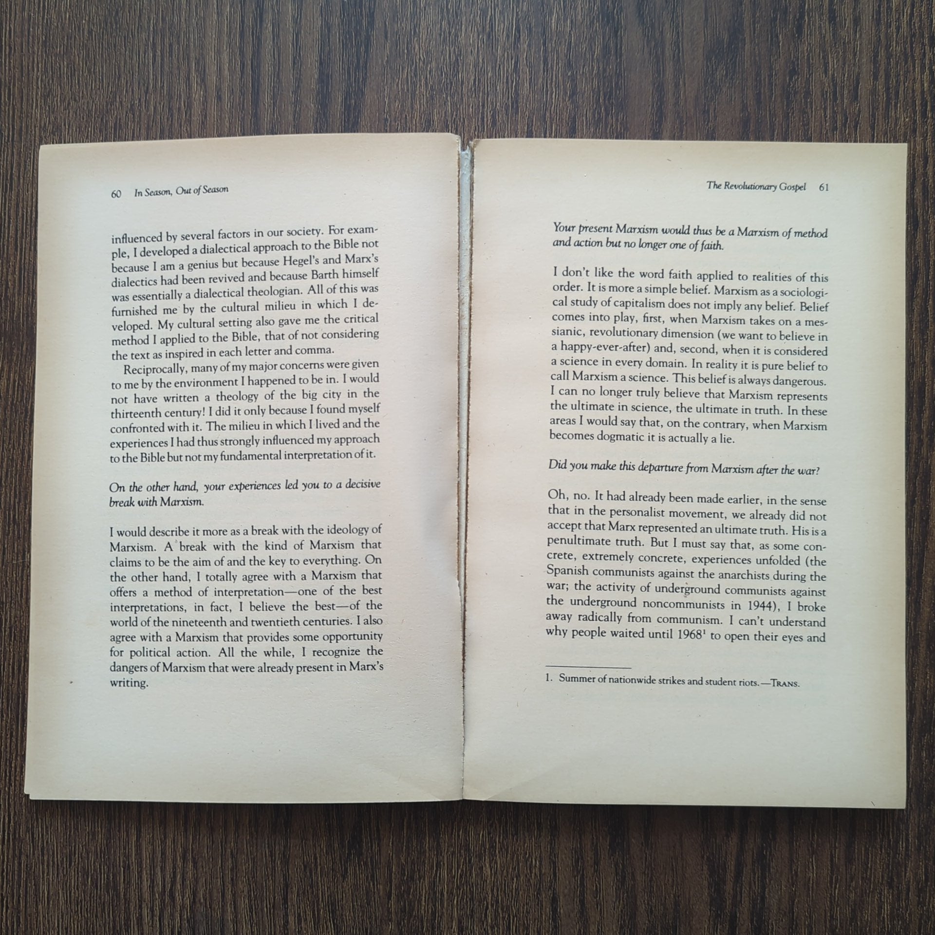 In Season, Out of Season offers the general reader a comprehensive, accessible introduction, in interview format, to the life and thought of contemporary theologian and social critic Jacques Ellul. Here is a lively, candid discussion of his early life; the influence of Kierkegaard, Marx, and Barth; his career at the University of Bordeaux; his frustrations working for reforms from within the religious and political establishment, and his frank assessment of his own impact.