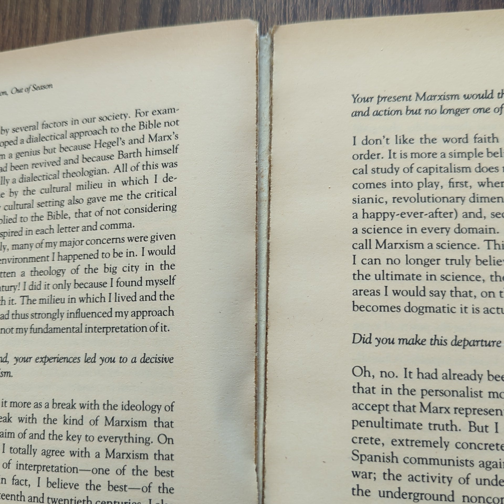 In Season, Out of Season also offers solid interpretation of central themes in his thinking: technology and the nation-state as a threat to humanity, the worldly church, the revo-lutionary character of the Christian Gospel, the permanent tension between the life of the church and the life of the world, and the "Wholly Other" character of God's presence in the world.