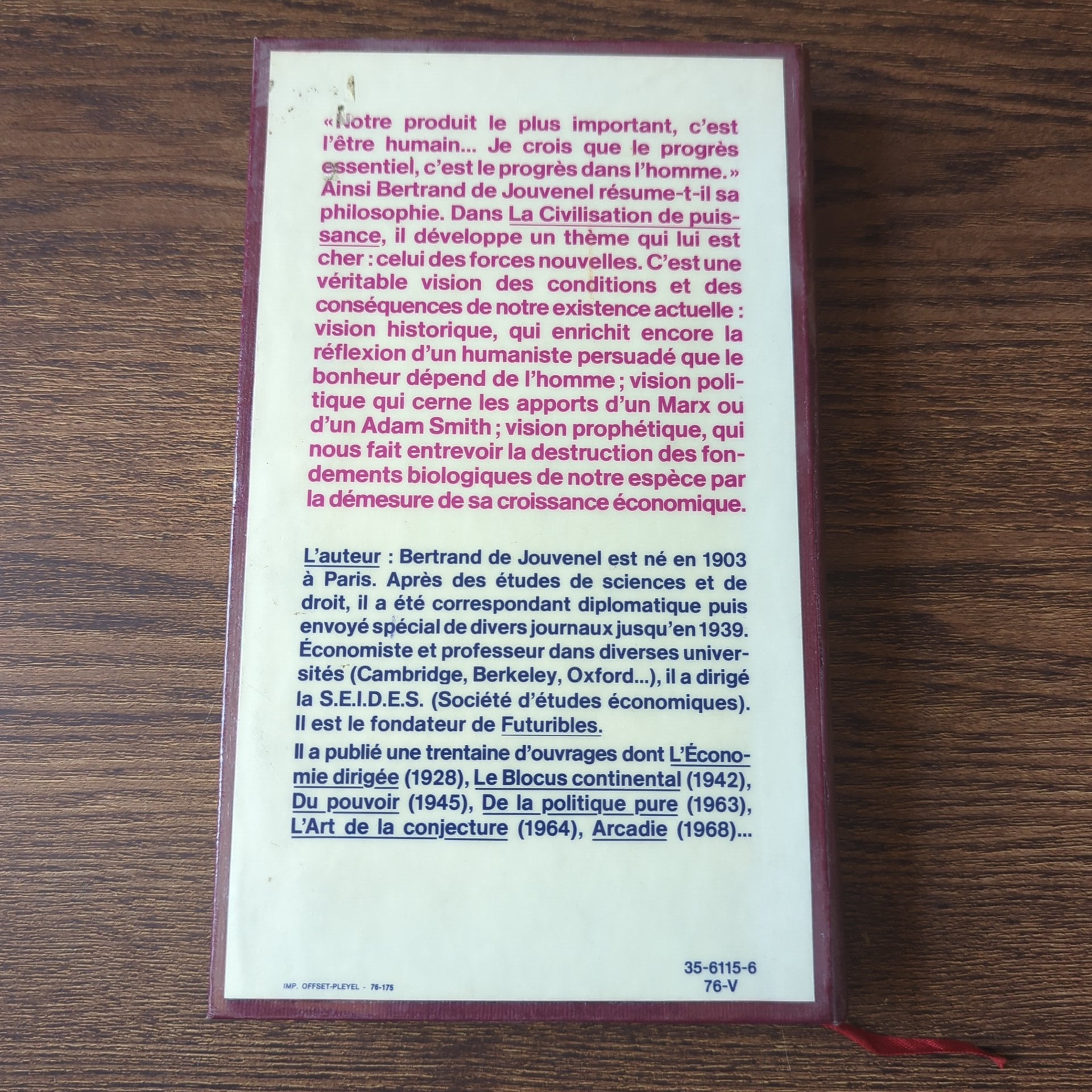 L'auteur: Bertrand de Jouvenel est né en 1903 à Paris. Après des études de sciences et de droit, il a été correspondant diplomatique puis envoyé spécial de divers journaux jusqu'en 1939. Économiste et professeur dans diverses univer-sités (Cambridge, Berkeley, Oxford...), il a dirigé la S.E.I.D.E.S. (Société d'études économiques). Il est le fondateur de Futuribles.