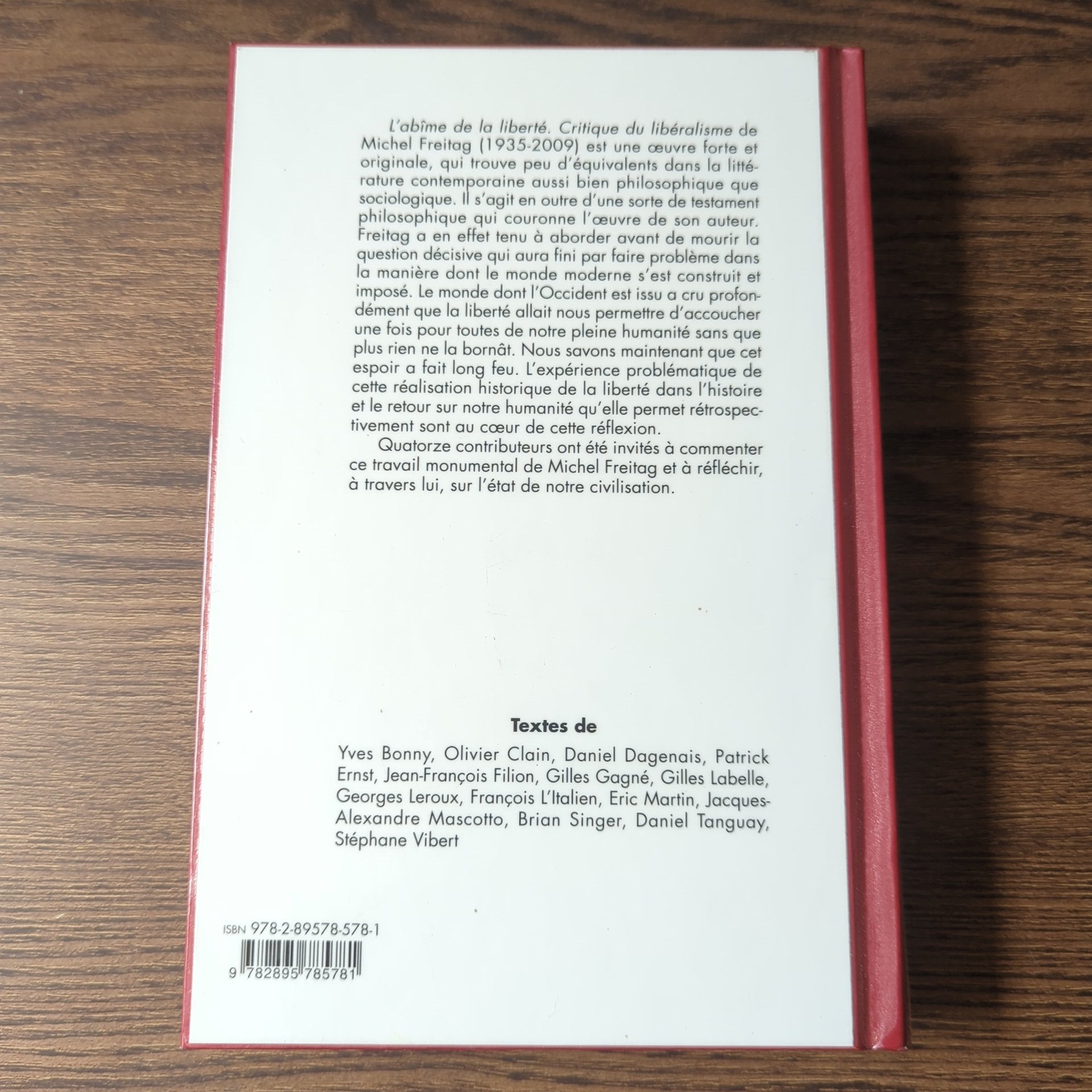 L’abîme de la liberté. Critique du libéralisme de Michel Freitag (1935‑2009) est une œuvre forte et originale, qui trouve peu d’équivalents dans la littérature contemporaine aussi bien philosophique que sociologique. Il s’agit en outre d’une sorte de testament philosophique qui couronne l’œuvre de son auteur. Freitag a en effet tenu à aborder avant de mourir la question décisive qui aura fini par faire problème dans la manière dont le monde moderne s’est construit et imposé. Le monde dont l’Occident est issu a cru profondément que la liberté allait nous permettre d’accoucher une fois pour toutes de notre pleine humanité sans que plus rien ne la bornât. Nous savons maintenant que cet espoir a fait long feu. L’expérience problématique de cette réalisation historique de la liberté dans l’histoire et le retour sur notre humanité qu’elle permet rétrospectivement sont au cœur de cette réflexion.