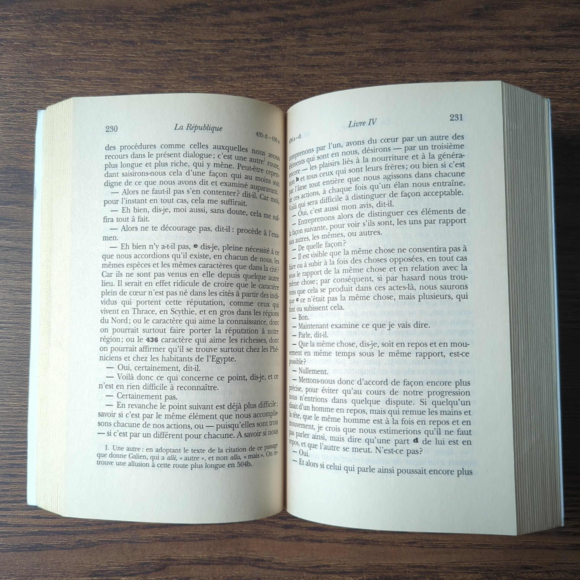 Si j’ai désiré, après tant d’autres, traduire en français La République, c’est d’abord pour avoir pensé qu’il était possible de faire mieux que ce qui avait été fait avant moi : de se tenir plus près du texte grec, de l’articulation de ses phrases, de son économie dans le choix des mots, de sa souplesse, de la variété des tons qu’il prête aux participants du dialogue que rapporte Socrate ; mais c’est aussi, et peut-être surtout, par désir de m’approcher le plus possible de ce texte, l’un des plus beaux du patrimoine littéraire, en me soumettant à la nécessité de le lire et relire, puis d’écrire des mots, des expressions, des phrases dignes de le représenter, de se substituer à lui.