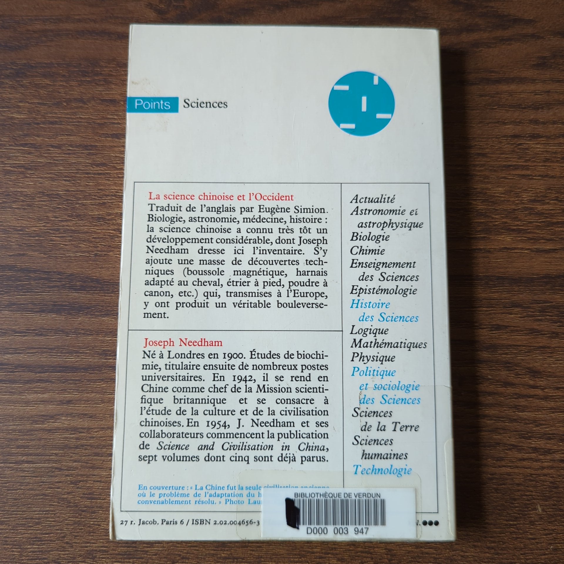 Traduit de l'anglais par Eugène Simion. Biologie, astronomie, médecine, histoire: la science chinoise a connu très tôt un développement considérable, dont Joseph Needham dresse ici l'inventaire. S'y ajoute une masse de découvertes techniques (boussole magnétique, harnais adapté au cheval, étrier à pied, poudre à canon, etc.) qui, transmises à l'Europe, y ont produit un véritable bouleversement.
