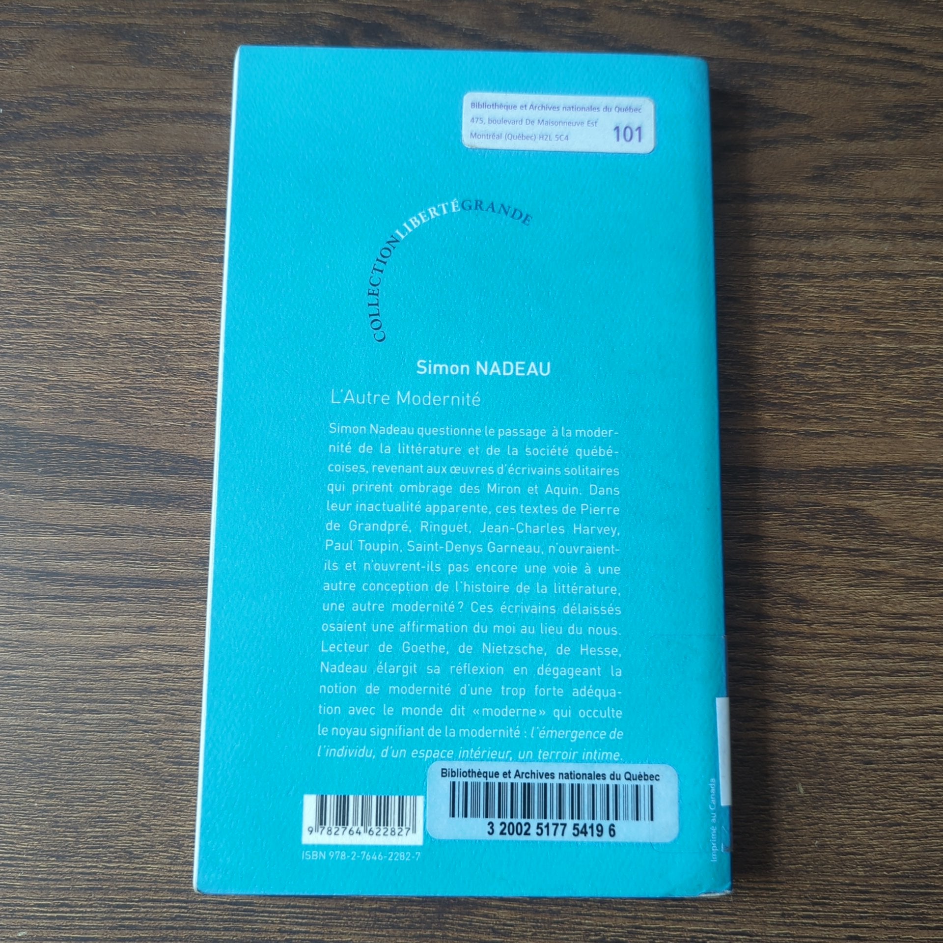 Simon Nadeau questionne le passage à la modernité de la littérature et de la société québécoises, revenant aux œuvres d'écrivains solitaires qui prirent ombrage des Miron et Aquin. Dans leur inactualité apparente, ces textes de Pierre de Grandpré, Ringuet, Jean-Charles Harvey, Paul Toupin, Saint-Denys Garneau, n'ouvraient-ils et n'ouvrent-ils pas encore une voie à une autre conception de l'histoire de la littérature, une autre modernité? Ces écrivains délaissés osaient une affirmation du moi au lieu du nous. Lecteur de Goethe, de Nietzsche, de Hesse, Nadeau élargit sa réflexion en dégageant la notion de modernité d'une trop forte adéquation avec le monde dit moderne qui occulte le noyau signifiant de la modernité: l'émergence de l'individu, d'un espace intérieur, un terroir intime.