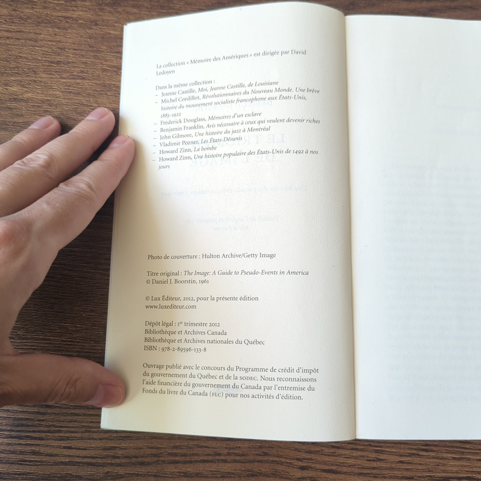 Aux États-Unis, en pleine effervescence des années 1960, la révolution de l'image bat son plein. Le dynamisme des médias de masse, de la publicité, du vedettariat et du marketing est à son comble. Sous la réussite, cependant, Daniel J. Boorstin perçoit la menace: celle d'une substitution, dans la culture américaine, de l'image à la réalité.