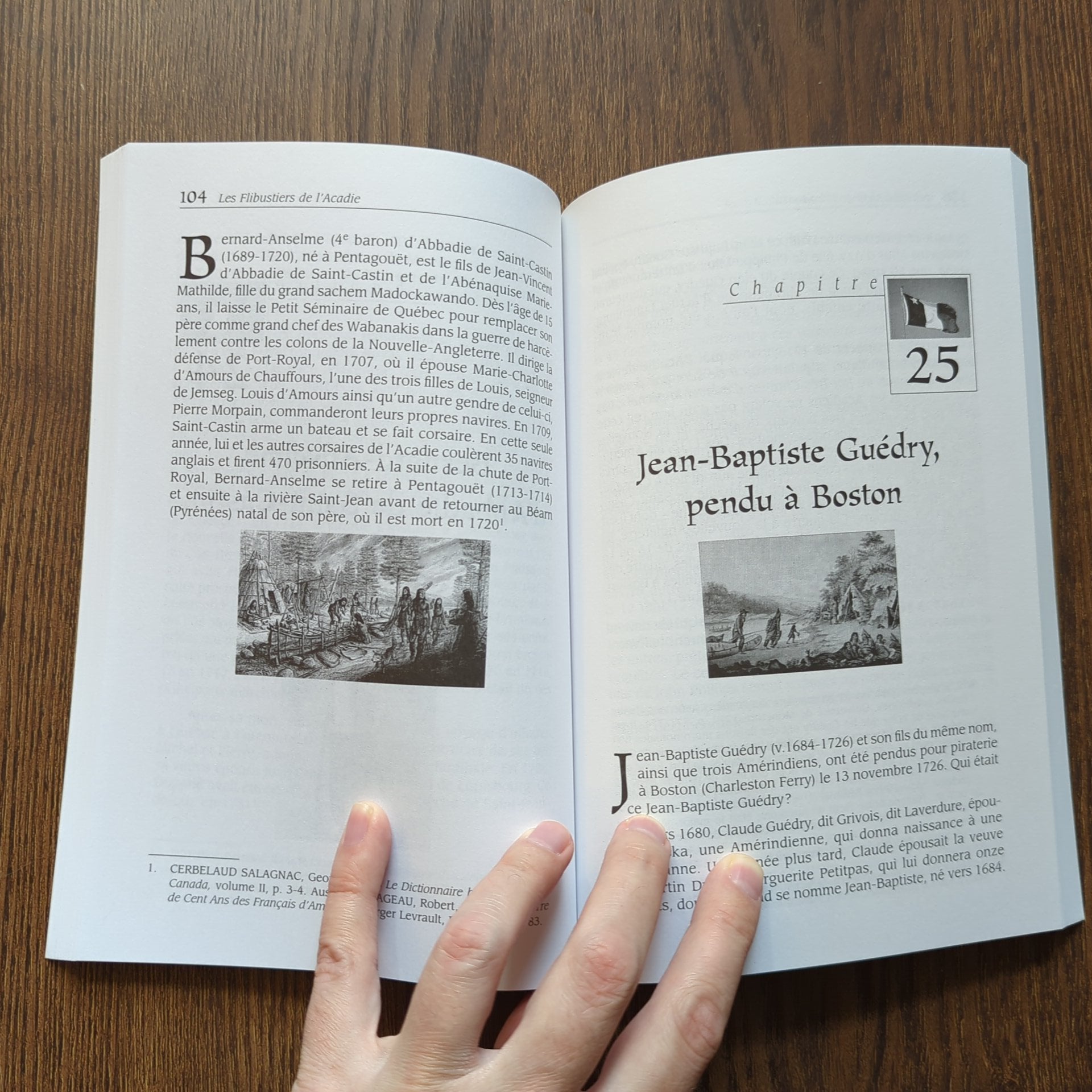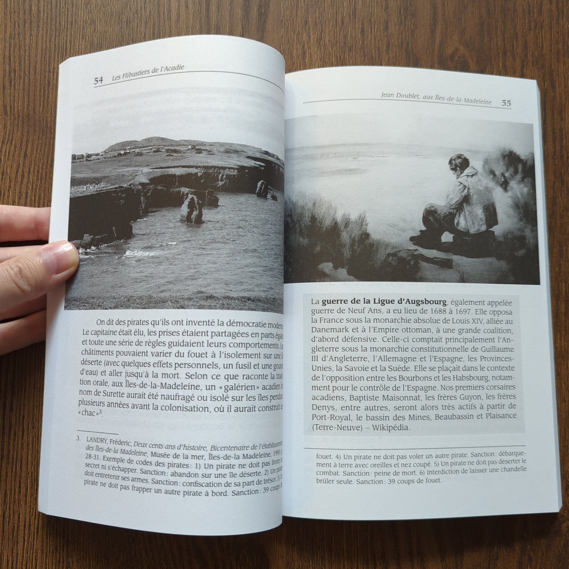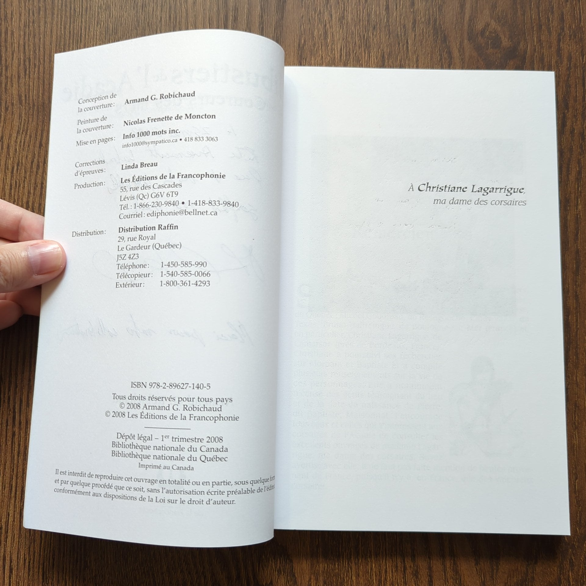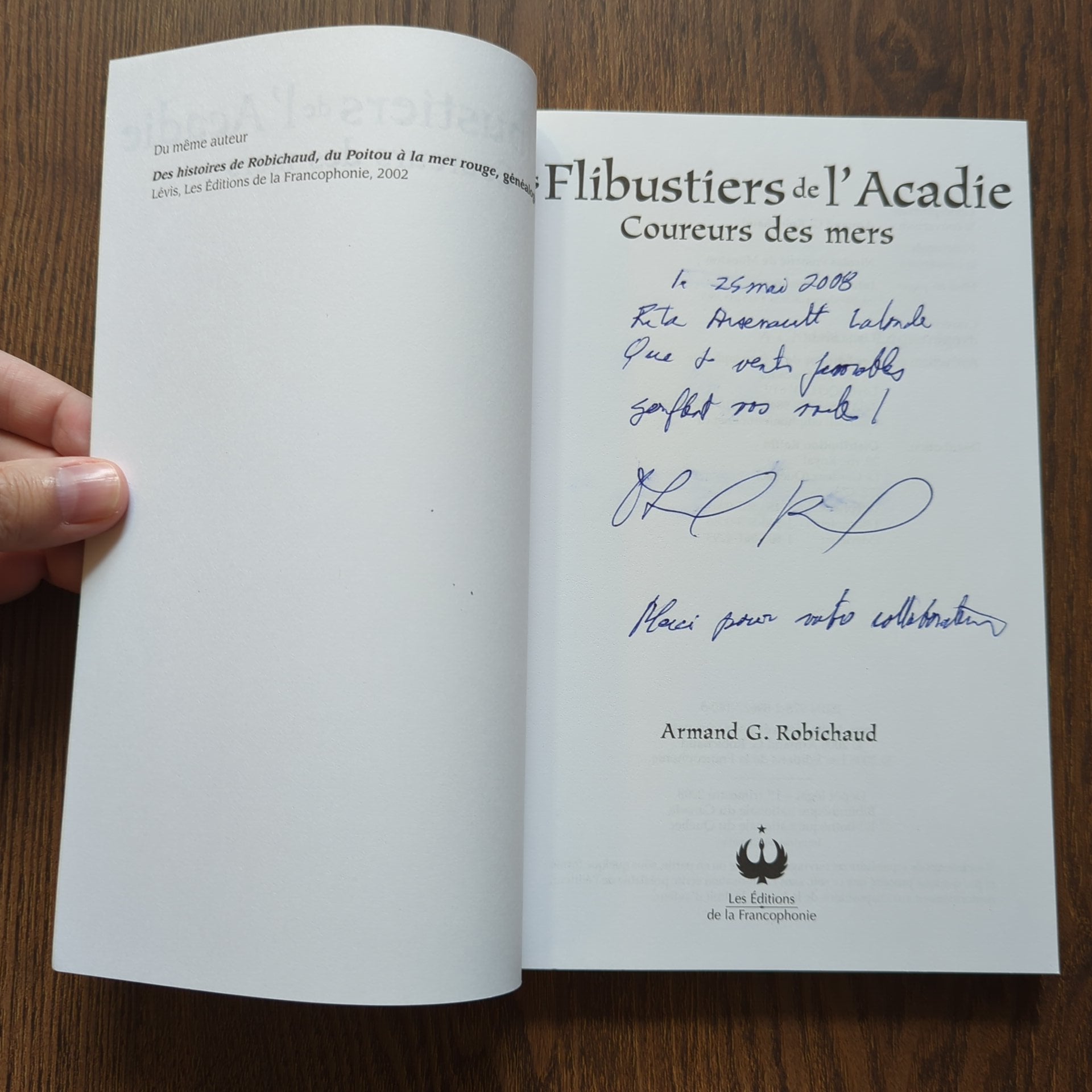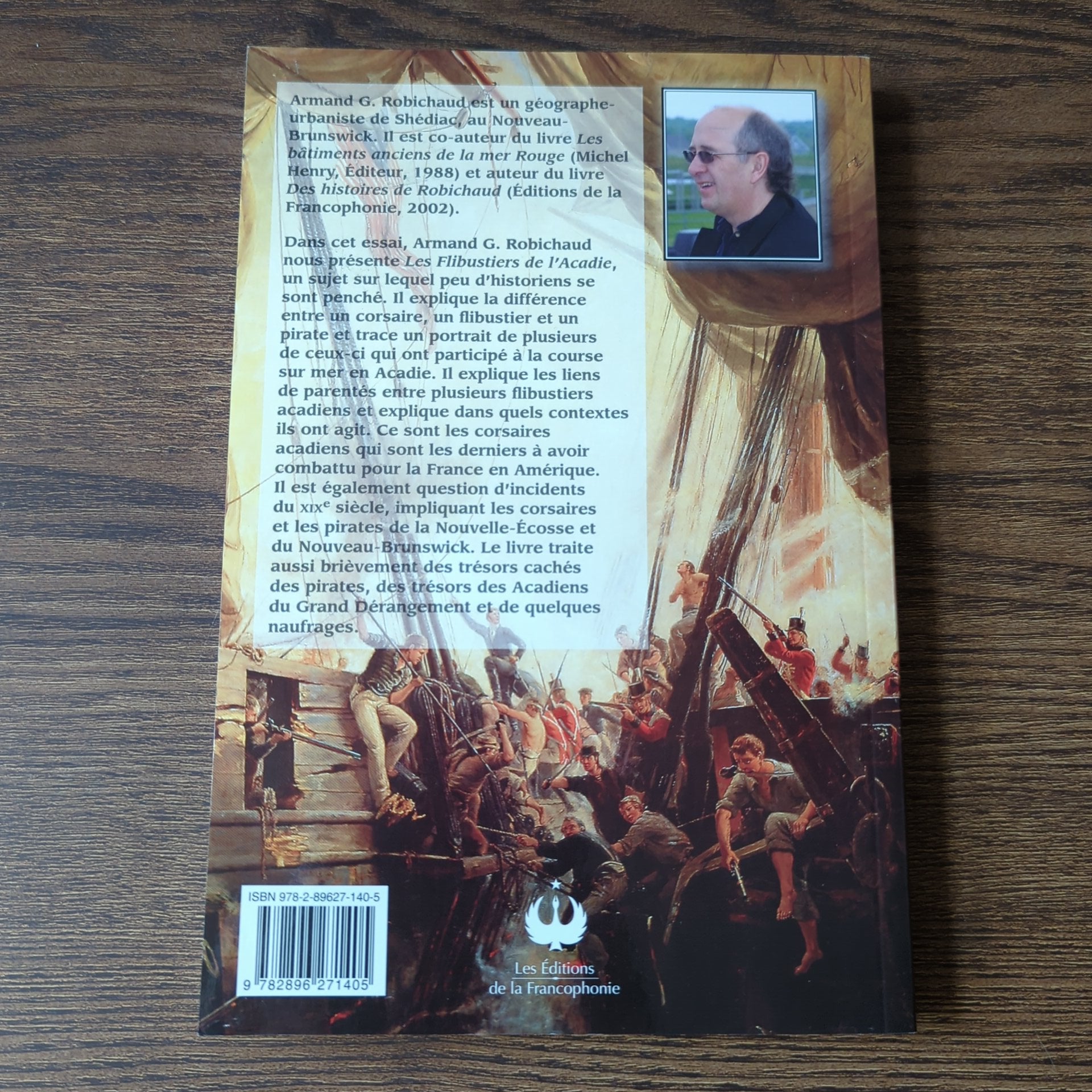 Dans cet essai, Armand G. Robichaud nous présente Les Flibustiers de l'Acadie, un sujet sur lequel peu d'historiens se sont penché. Il explique la différence entre un corsaire, un flibustier et un pirate et trace un portrait de plusieurs de ceux-ci qui ont participé à la course sur mer en Acadie. Il explique les liens de parentés entre plusieurs flibustiers acadiens et explique dans quels contextes ils ont agit. Ce sont les corsaires acadiens qui sont les derniers à avoir combattu pour la France en Amérique. Il est également question d'incidents du XIXè siècle, impliquant les corsaires et les pirates de la Nouvelle-Écosse et du Nouveau-Brunswick. Le livre traite aussi brièvement des trésors cachés des pirates, des trésors des Acadiens du Grand Dérangement et de quelques naufrages.