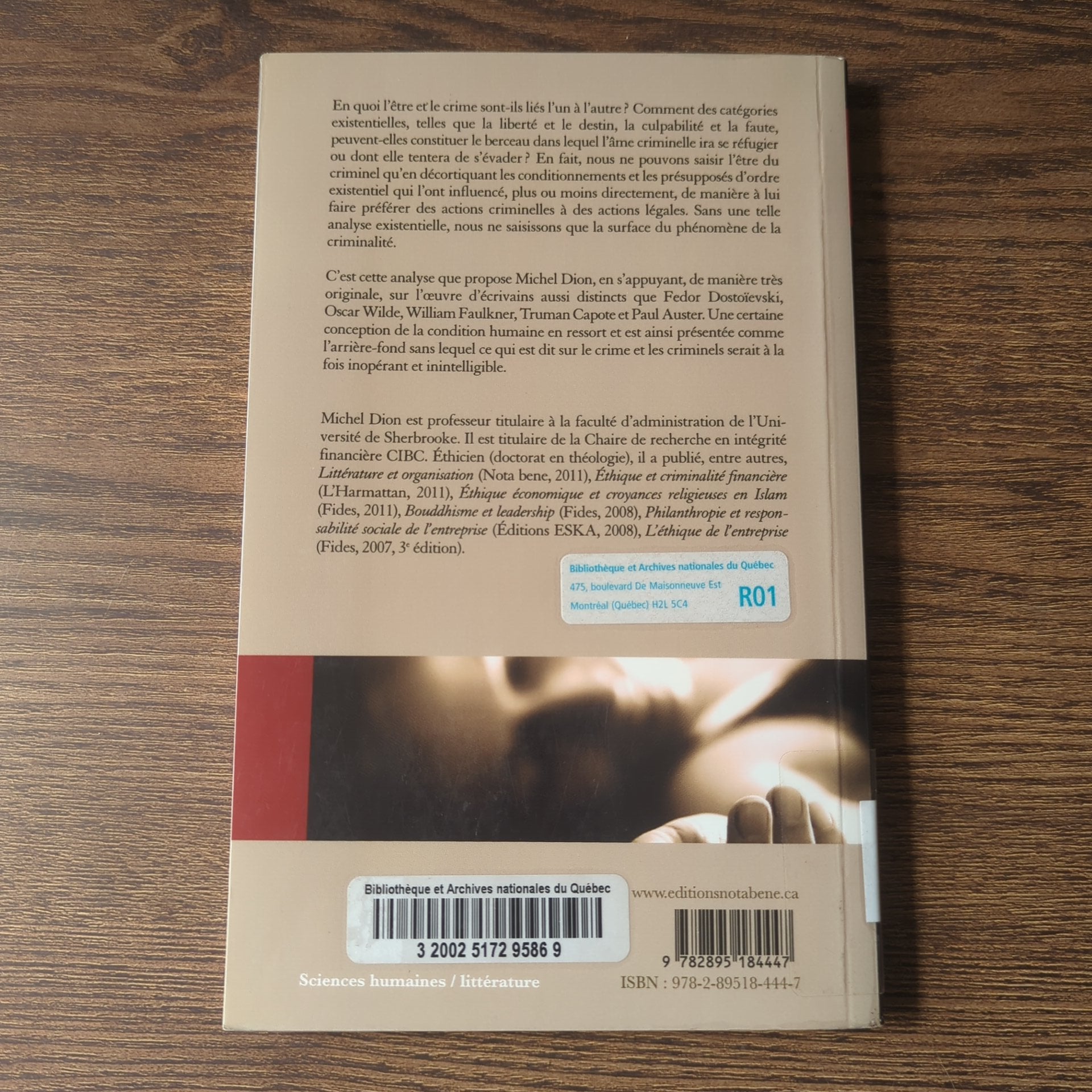 C'est cette analyse que propose Michel Dion, en s'appuyant, de manière très originale, sur l'œuvre d'écrivains aussi distincts que Fedor Dostojevski, Oscar Wilde, William Faulkner, Truman Capote et Paul Auster. Une certaine conception de la condition humaine en ressort et est ainsi présentée comme l'arrière-fond sans lequel ce qui est dit sur le crime et les criminels serait à la fois inopérant et inintelligible.