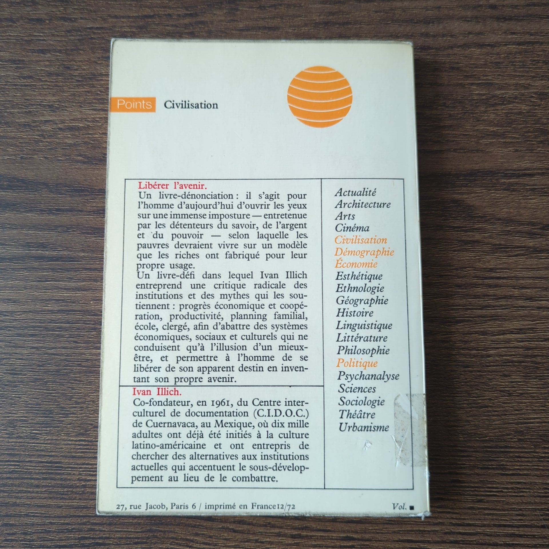 Un livre-défi dans lequel Ivan Illich entreprend une critique radicale des institutions et des mythes qui les soutiennent: progrès économique et coopération, productivité, planning familial, école, clergé, afin d'abattre des systèmes économiques, sociaux et culturels qui ne conduisent qu'à l'illusion d'un mieux-être, et permettre à l'homme de se libérer de son apparent destin en inventant son propre avenir.