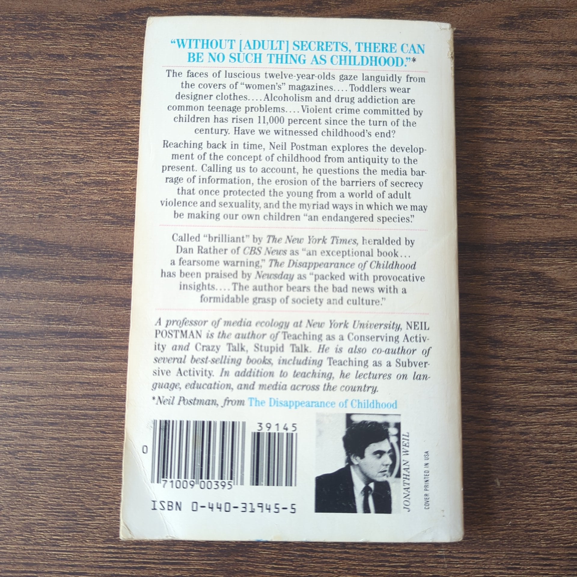 Reaching back in time, Neil Postman explores the development of the concept of childhood from antiquity to the present. Calling us to account, he questions the media barrage of information, the erosion of the barriers of secrecy that once protected the young from a world of adult violence and sexuality, and the myriad ways in which we may be making our own children "an endangered species".
