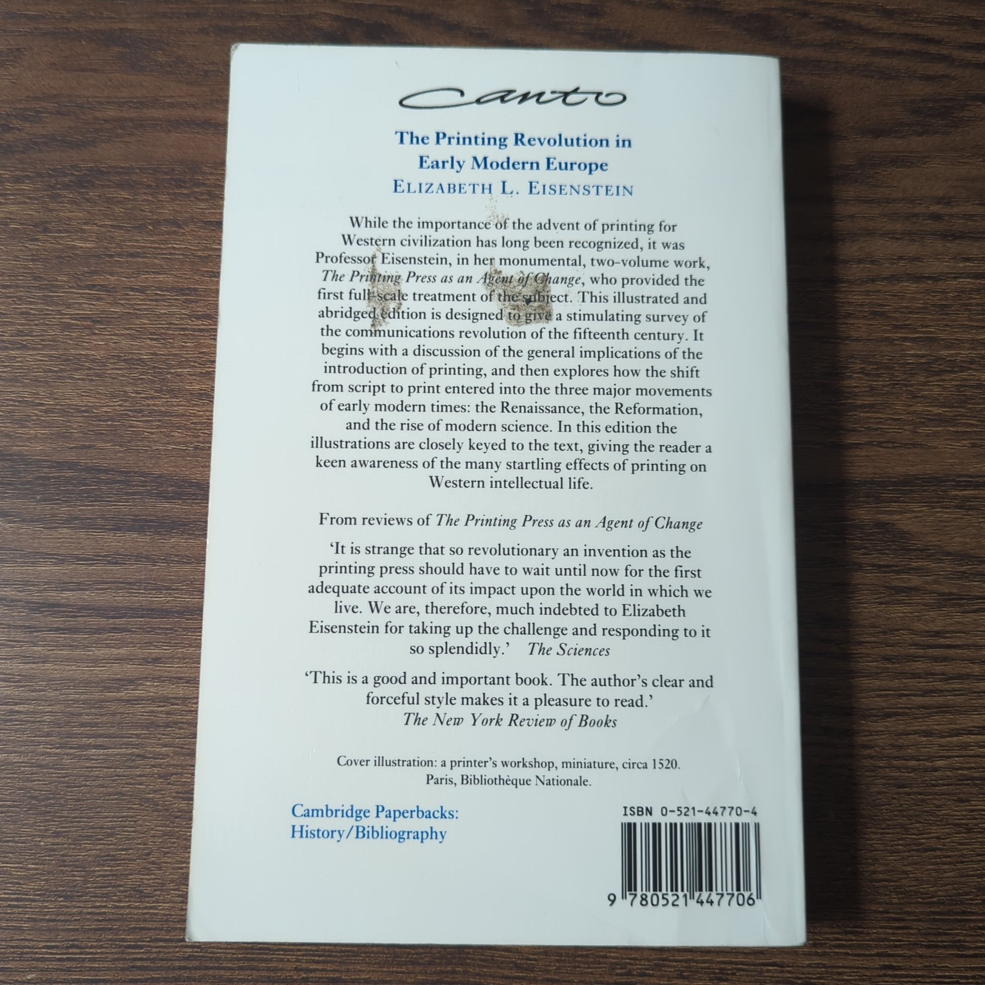 "It is strange that so revolutionary an invention as the printing press should have to wait until now for the first adequate account of its impact upon the world in which we live. We are, therefore, much indebted to Elizabeth Eisenstein for taking up the challenge and responding to it so splendidly."