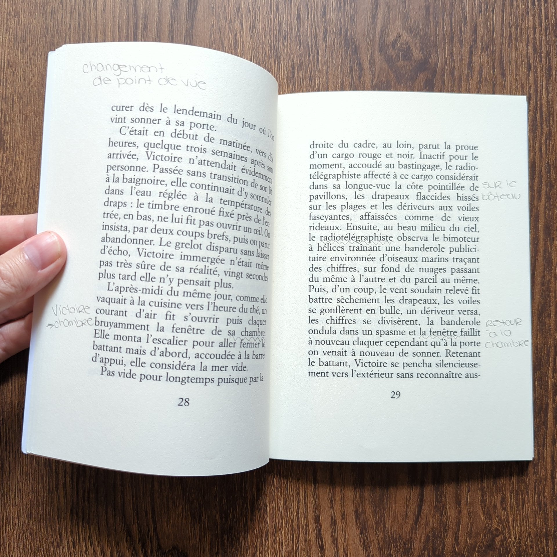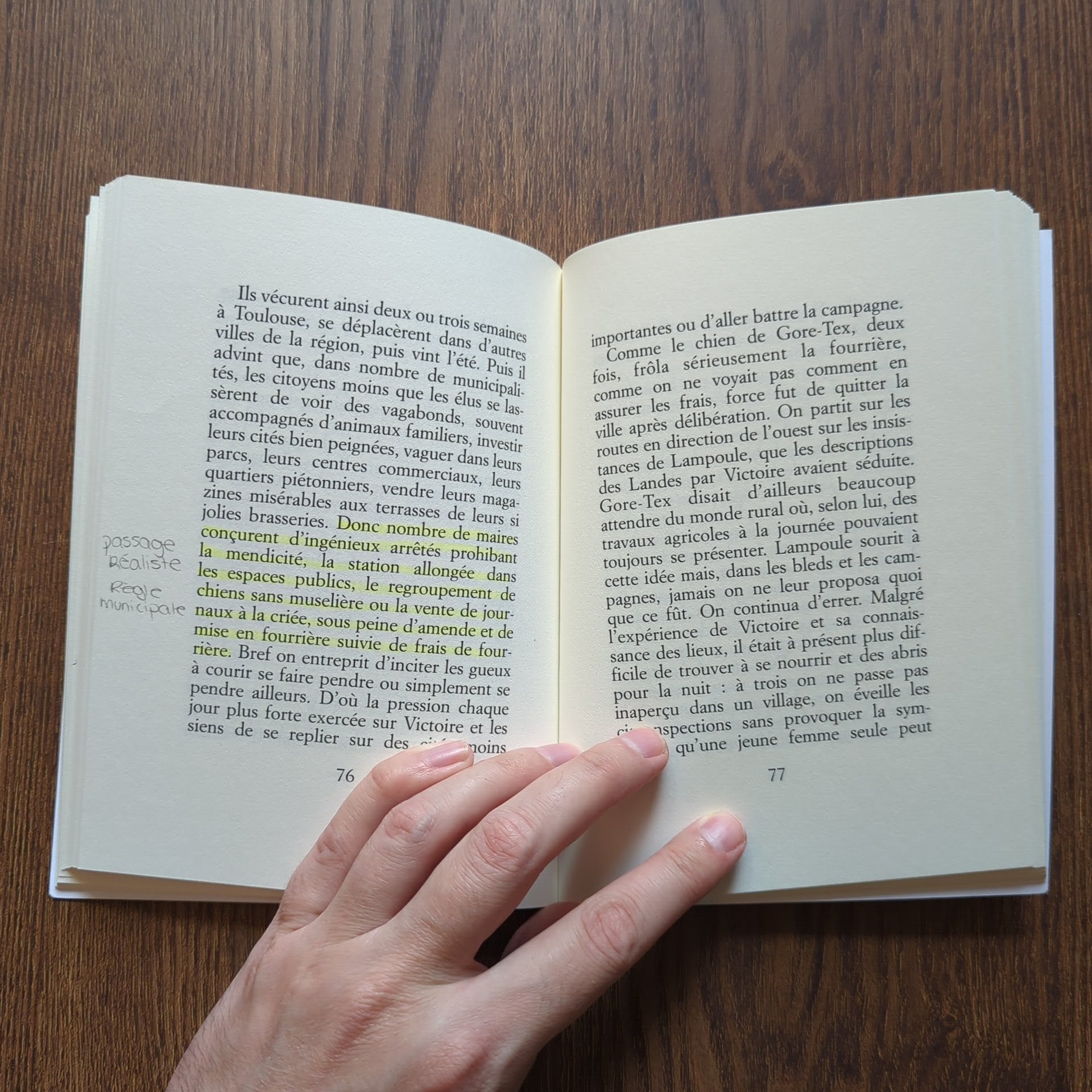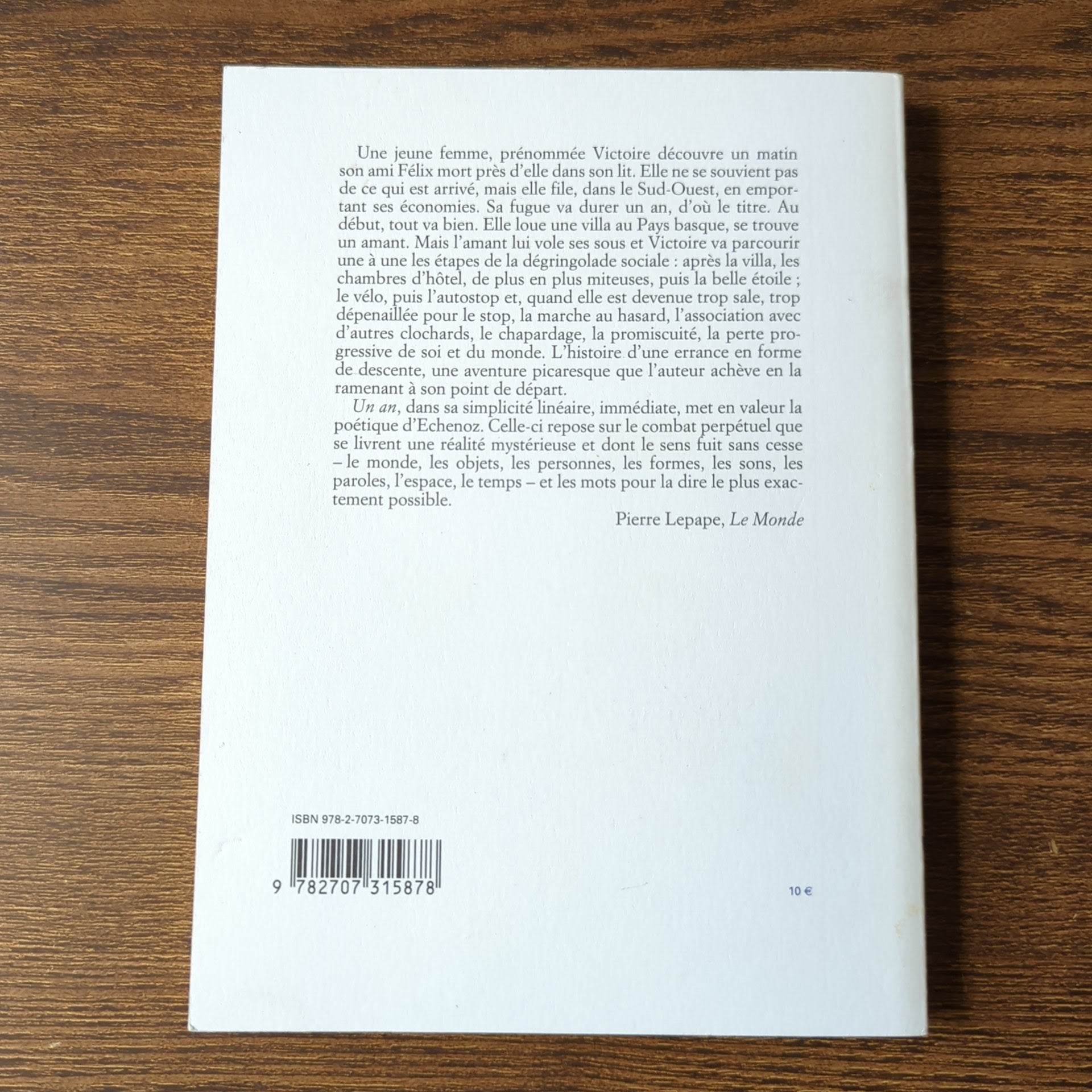 Une jeune femme, prénommée Victoire découvre un matin son ami Félix mort près d'elle dans son lit. Elle ne se souvient pas de ce qui est arrivé, mais elle file, dans le Sud-Ouest, en emportant ses économies. Sa fugue va durer un an, d'où le titre. Au début, tout va bien. Elle loue une villa au Pays basque, se trouve un amant. Mais l'amant lui vole ses sous et Victoire va parcourir une à une les étapes de la dégringolade sociale: après la villa, les chambres d'hôtel, de plus en plus miteuses, puis la belle étoile; le vélo, puis l'autostop et, quand elle est devenue trop sale, trop dépenaillée pour le stop, la marche au hasard, l'association avec d'autres clochards, le chapardage, la promiscuité, la perte progressive de soi et du monde. L'histoire d'une errance en forme de descente, une aventure picaresque que l'auteur achève en la ramenant à son point de départ.
