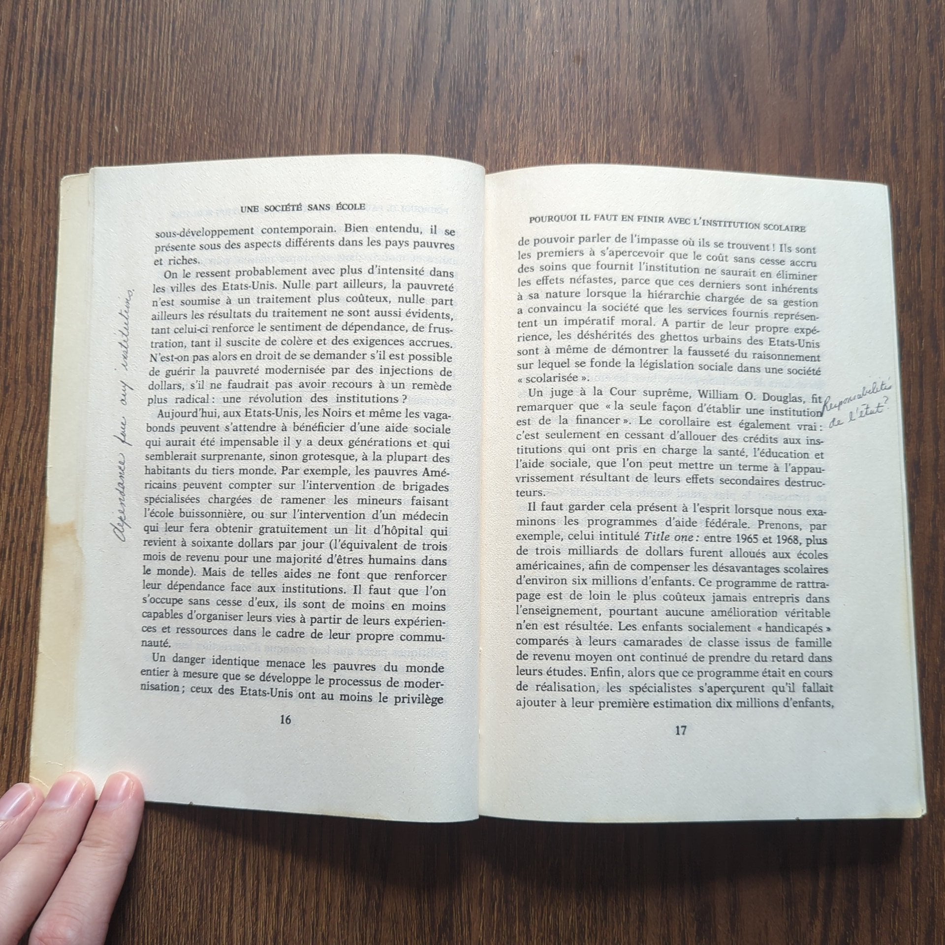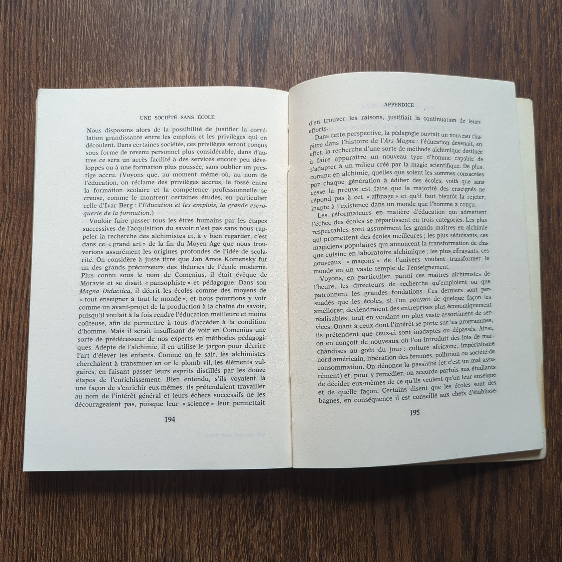 Plus de crédits démesurés aux institutions (scolaires ou autres). Que les moyens d'acquérir ou de transmettre un savoir soient mis en commun et librement accessibles à tous. Plus de maîtres à la fois gardiens de l'ordre établi, prédicateurs et thérapeutes. Mais des échanges entre « égaux », des éducateurs indépendants...